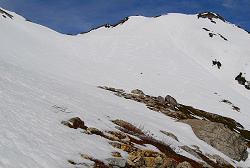 まだ時間が早かったので、斜面はカチカチの状態である。雪崩が怖いので急いで安全な場所へ行きたいが、シールがスリップしてしまい先へ進めそうにない。アイゼンに切り替えて山頂を目指すことにした。
