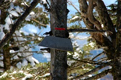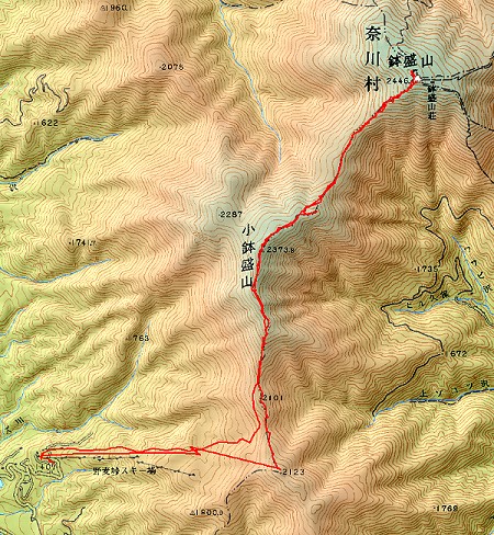 小鉢盛山まで戻ると2人組がお茶していた。ここでシールを外し、ひたすら斜滑降で下る。ときどき罠に嵌って行く手を遮られるが、ひたすらトラバースを続けてゲレンデに飛び出した。