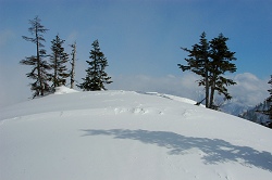 今日はスノーシューで自然園方面に遊びに行った人はいないようだ。真っ白な雪原はステップで遊ぶには手頃で、雪がフカフカだったら曲がる自信もあるけど、モナカだったら簡単に撃沈する自信もある。