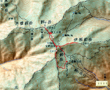 翌日は真っ白で足元しか見えず、仕方なくロープウェイ乗り場に直行。 以前、どこかで中央アルプスの地図を失くしてしまったので、ロープウェイ乗り場の売店で地図を調達するが、ちょっと割高だった。