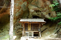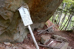 しばらくすると九頭龍社に到着した。 「九頭龍権現を祀る。戸隠より分けてもらった水樽が納めてある。岩殿山権現のら伽水という。干ばつの時は、巨岩の下から湧き出る水をかき回し、雨乞い祈願をすると不思議と雨となり田畑を潤したと伝えられる。」