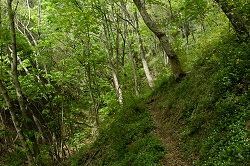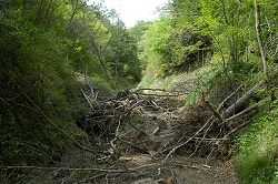 流木や土砂が流れた様子を観察すると、この辺りは激しく水が流れたようだ。土砂崩れがあちこちに見えて、何とも痛々しい姿だ。