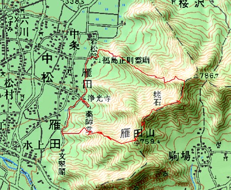 姥石(うばいし) 山麓から見ると、子供に寄り添う大人のように大きな岩が空に突っ立っている。昔、遠洞湖(えんとこ)田んぼは、一面の湖水だった。雨期になると大洪水になり、水田が荒らされるので洪水のときは、全く恨みの湖だった。そんな時、ある姥が孫と一緒に雁田山に登った。眼下に満々たる湖を眺めて姥は、「きれいな湖だなあ」と感嘆した。その途端に姥と孫は石になってしまったという。高さ10m。姨石(おばいし)とも呼ばれる。