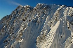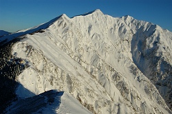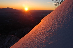 今日もラッセルが続くが、稜線に到達すれば楽になる。日の出の時間になったので、足場を作ってカメラを取り出すが、先頭がラッセルをする度に雪が落ちてくる。弱層も見つからず、雪質も安定しているので、のんびり出来たが、輪カンを履かないと足元が崩れて、なかなか前に進まない。