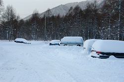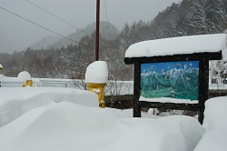 指定の時間に仲間が現れないのでゲート前から数m歩いてみるが、トレースを外すと太股まで雪がある。まだまだ降り続きそうな感じで、駐車場から輪カンを装着して歩きだす事にした。