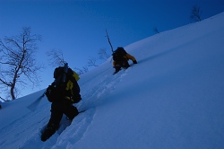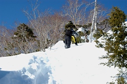 前日のトレースが消えかかってて、急な斜面は完全にラッセルとなった。昨日に比べてラッセルは楽になったが、急登が続くので、重いザックを背負って登ると大変である。