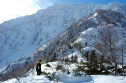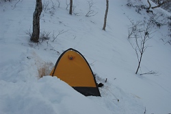 西俣出合いに到着したが、トーレスが無くて、その先に進むか判断に迷う。とりあえず偵察しながら赤岩尾根に取り付くが、しばらくすると高千穂平から5時間掛かって下山してきたパーティーがやってきた。胸まで雪があって、その先にトレースが無いと言っている。とりあえず明日の目標は高千穂平に決まったので、早めに寝ることにした。