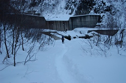 最初にテントで泊まった場所まで戻ると日が陰り始めていた。気温が上昇してたようで、林道脇で雪崩が発生していた。斜面から転がり落ちたロールケーキが芸術的だったが、真っ暗で撮影できなかった。