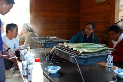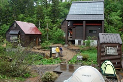 だんだんと日が暮れてきて、豆電球を点灯させて宴会は続く。 ソーラーパネルを設置した事により、冷蔵庫と電子レンジが使えるようになったけど、まだまだ素朴な山小屋だ。