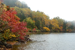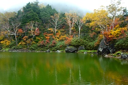 小敷池に移動すると、池と紅葉は綺麗だったが、青空が無いので寂しい。しばらく見ていたけど、晴れそうな予感がしないので諦めて下山することに決定。