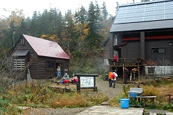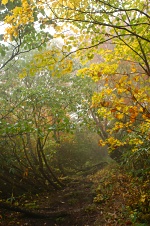 歩き始めてしばらくすると、赤や黄色で飾られた泥どろの登山道になった。紅葉と霧で幻想的な景色が広がったが、足元は最悪である。ザックも置けず、油断してると転びそうだ。