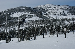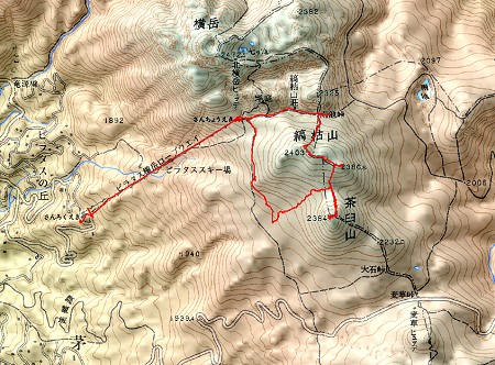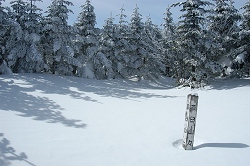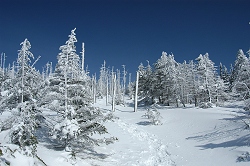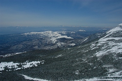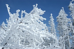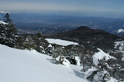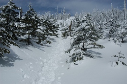 今日は風も穏やかで縞枯山荘の煙突から煙がモクモクと立ち昇っている。とっても心地よい日である。前日の雪でトレースも完全に消えてしまい、ストックを持ってない身でありながらスノーシューでラッセルする。ほどなくすると縞枯山の山頂に到着した。青空と樹氷は今日1番の景色である。