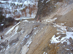 しばらくすると平成18年に発生した豪雨災害で林道が半分以上崩れた場所に到着した。ここを復活させるには大規模な工事が必要だと思うが、通行量から考えると、このままの状態が続くかもしれない。