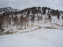 西暦の山に行きたいが、スキーツアーもしたい。野湯探索にも行きたい。そんな事なので、黒湯山から湧き出る五色温泉と奥日陰の湯、それから山の反対側にある万座温泉に入るつもりで七味温泉にやってきた。