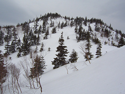今日はステップ板で来てしまったので、帰りも歩きになることは間違いないだろう。すっかりザラメになってると思っていたが、日陰にはサラサラのパウダーも残っているので板の選択を間違えたようだ。