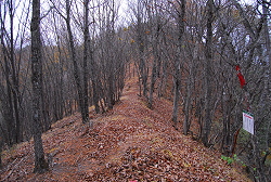 三国峠から三国山へ登る標識が見当たらず、トイレの周辺をウロウロしていたら獣道のような登山道があった。 稜線には「秩父山緑の回廊」という看板があり、「野生動植物の生育地の拡大と相互交流を促す」場所らしい。
