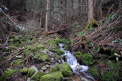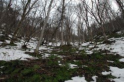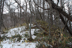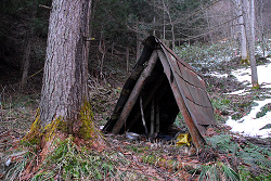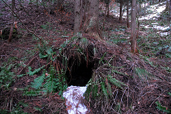 しばらくすると不思議な穴がある。熊でもいるかとドキドキしながら覗いてみると、石が組んであって人工的に作られたものだった。ちょっと先にはトタン屋根で作られた雨宿りする小屋もあって、吊る下げてあったヤカンから推測して、ずいぶん昔に放置されたようだ。 |