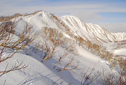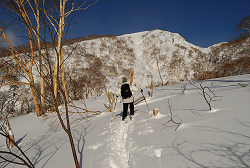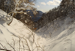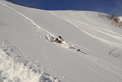 昨年の雪崩が起きた場所を観察しながら沢の横断場所に移動するが、ちょっと雪が少ないので、前日のトレースに従ってラッセルしている人達を追いかける。