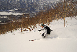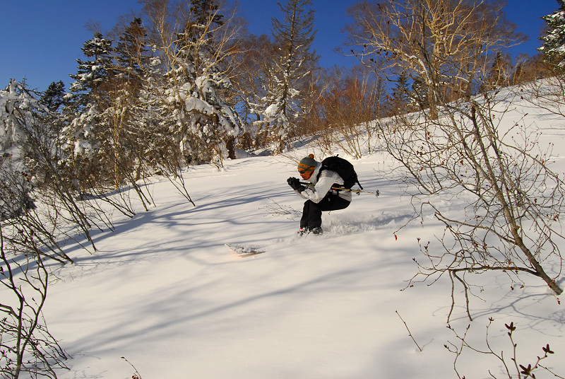 何とか外輪山までやってきたが、お鉢の底でまで滑って登り返すには雪が深すぎて難儀である。板を外せば腰まで埋もれそうな勢いだったので、少しだけ滑って遊んでみるが、重い雪を攻略できずに、さっさと下山を開始することにした。