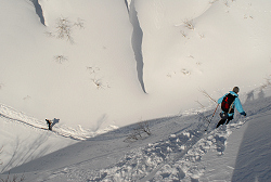 正月より雪屁が発達したようで良さそうな場所を選んで遊ぶ。手抜きをしてツボ足で上り返そうと頑張ったけど、予想以上に深くて、シールを装着して元の位置へ戻る。