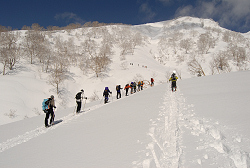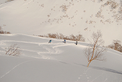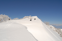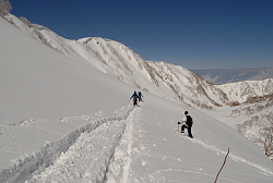コース内の雪崩チェックとかでリフトが動かず、だいぶ時間が経ってから入山口に到着。 リフトに乗るのが遅かったので先頭集団から大幅に遅れてしまったけど、アスリートの2人が猛然と追い上げて、あっという間に外輪山に到着した。