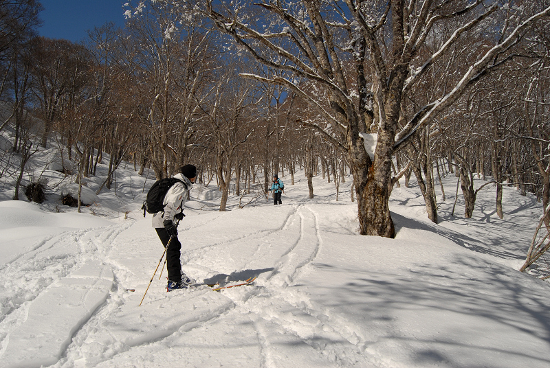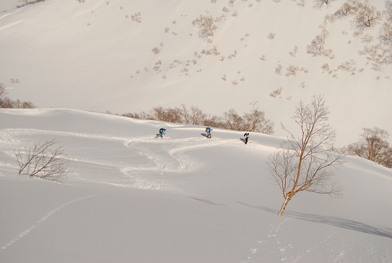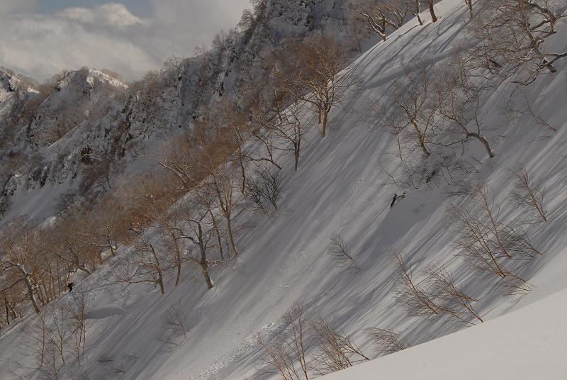 前日の悪天の影響で、深いところでは新雪が50cmほど積もっていたけど、凍っている部分もあるので慎重に滑り出す。