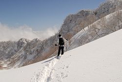 これ以上滑るのは危なそうだったので再び稜線まで戻り、今度は南側の重い雪と遊ぶ。 こちらはガリガリ君が多数存在するので、急にスピードが上がって怖い思いをする。