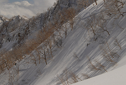 弱層となっている部分を気にしながら、いつもより下まで滑りこんでみたら、斜面から嫌な音が聞こえてきたと仲間が言っている。念の為に 弱層チェックをしていたら、隣の斜面を滑っていた人が派手に雪崩を発生させていた。