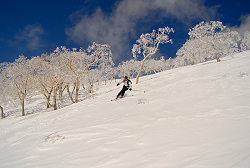 ゲレンデには軽い雪が5cmほど積もっている。待ち合わせの時間まで1時間ほどあるので、早朝券を利用してゴンドラ に乗り込んでみた。しかし、妙高では珍しほど軽い雪だったのに、まった滑らなくて面白くない。