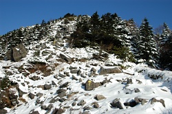 最初は黒斑山に登るつもりだったが、樹林帯が長そうだったので水の塔山に来て正解だった。 登山道からの眺めも良いし、北風も心地よい。昨日はガスってて、まったく雪が融けてないようだが、雪が少し舞っているので樹氷も綺麗だ。