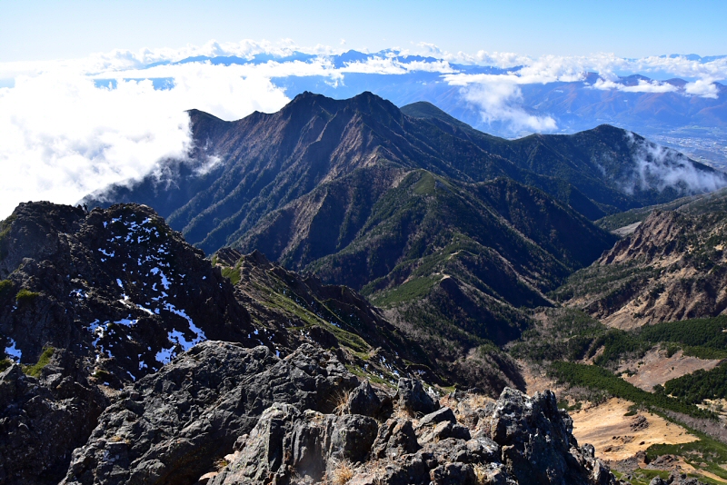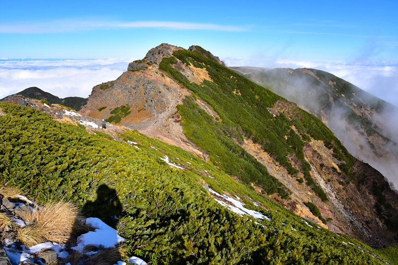 杣添尾根から赤岳に登る。日陰には数日前に降った雪が残っていたけど、まだまだ少ないような感じがする。冬の到来はこれからのようだ。 |