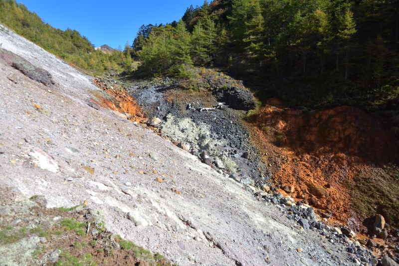 硫黄と鉄が混ざった所。登山道が風下だった為、少し臭かった。