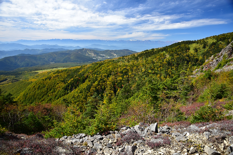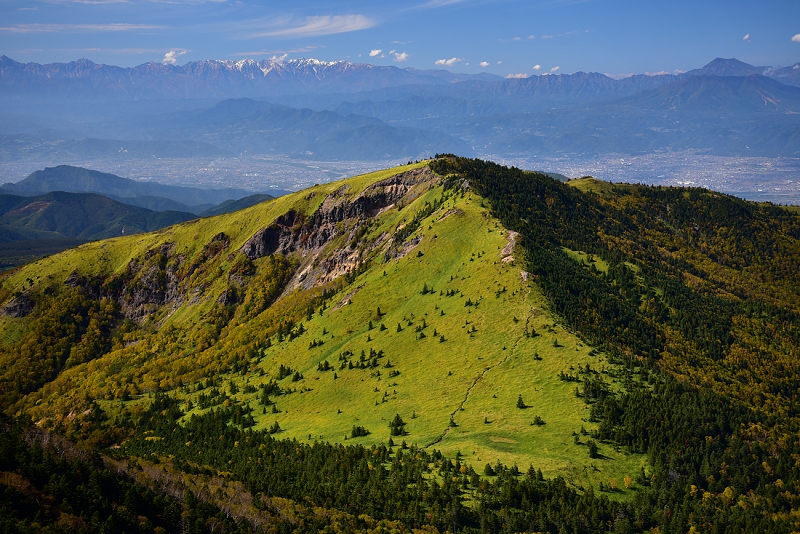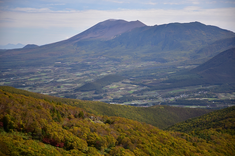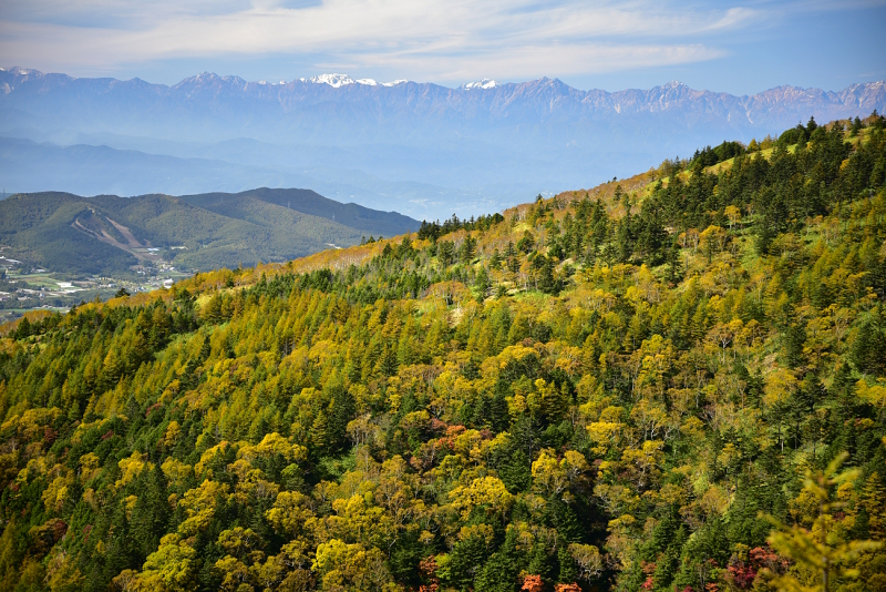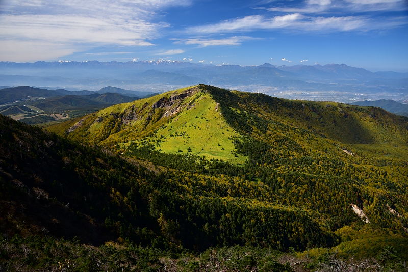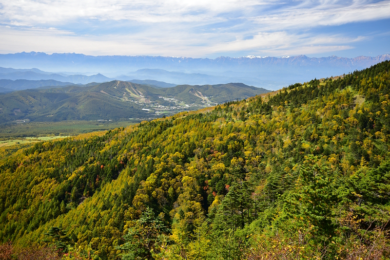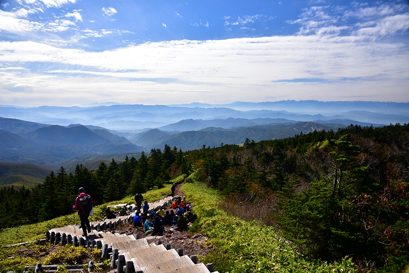 2000m付近の紅葉は見頃を迎え、根子岳の斜面は輝いて見えた。