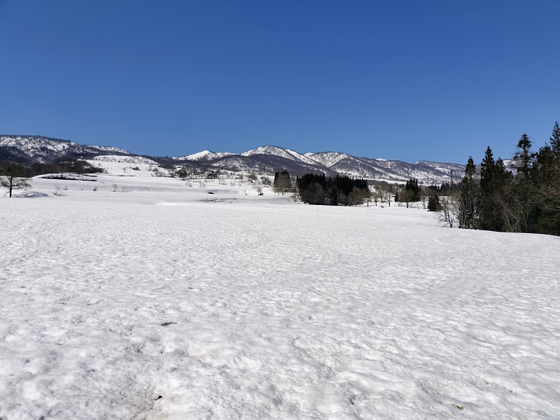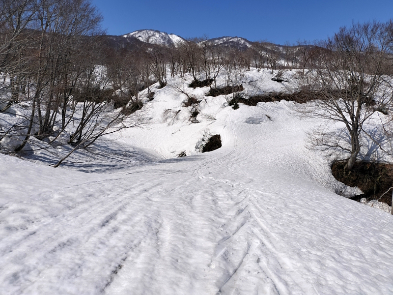 スノーボードの跡がありました。楽しく滑れたのはこの辺りまで。標高を落とさずトラバースを開始します。
