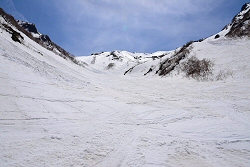 針ノ木谷は残雪が少なくなデブリも少なめ。ザラメ雪を快適に滑れるはずが、ベタベタになったシールが板に張り付き、ストップスノーを滑ってるような感じでした。