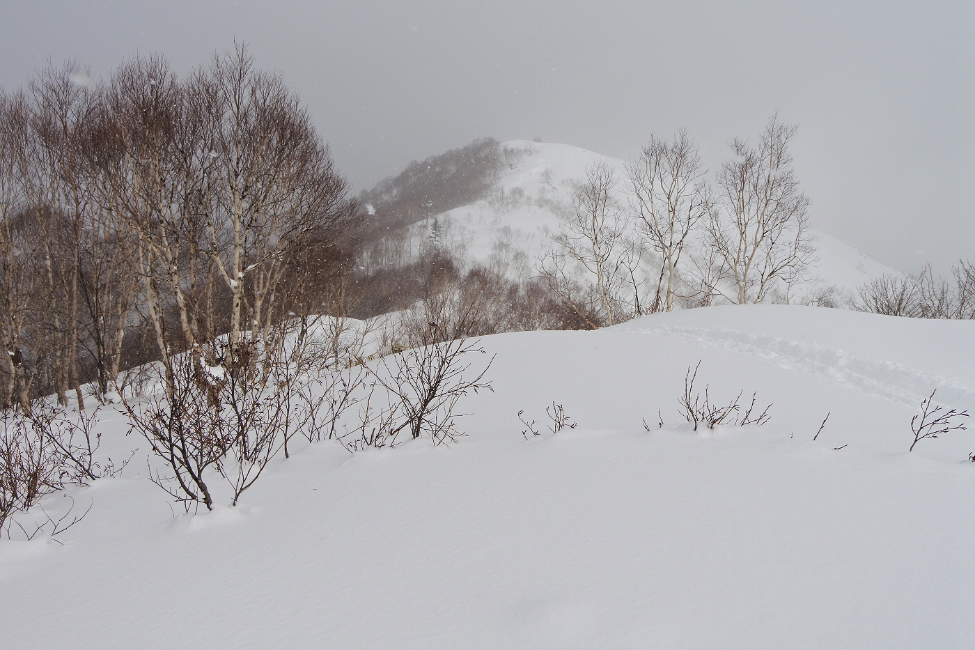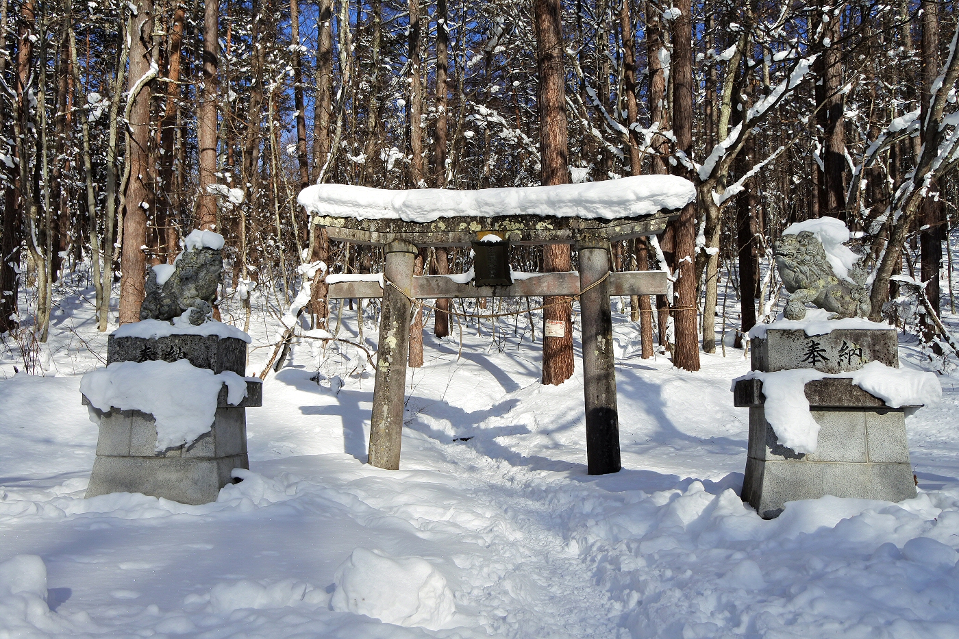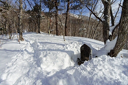 この先はトレースなし。吹雪いてきたので神社で休憩する事にしました。