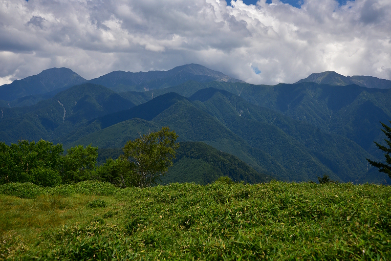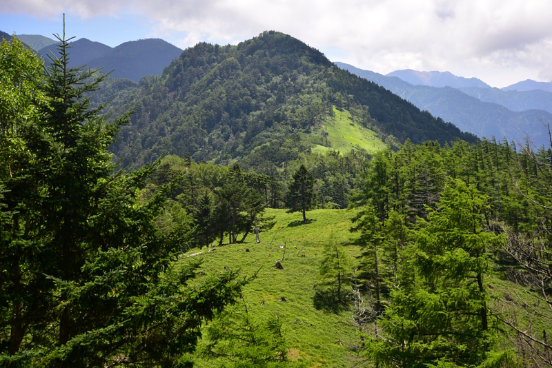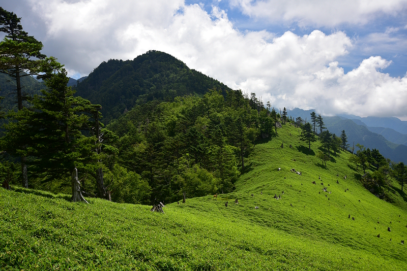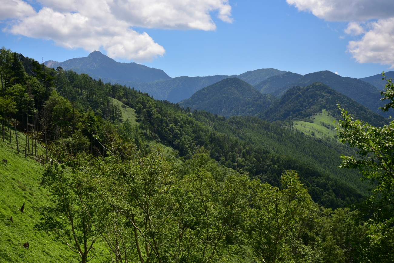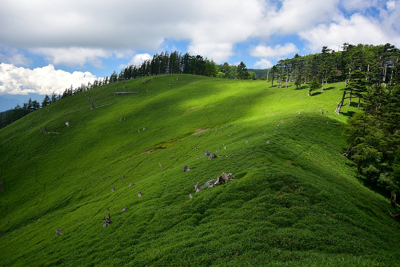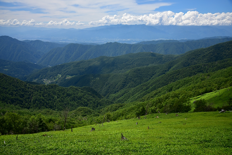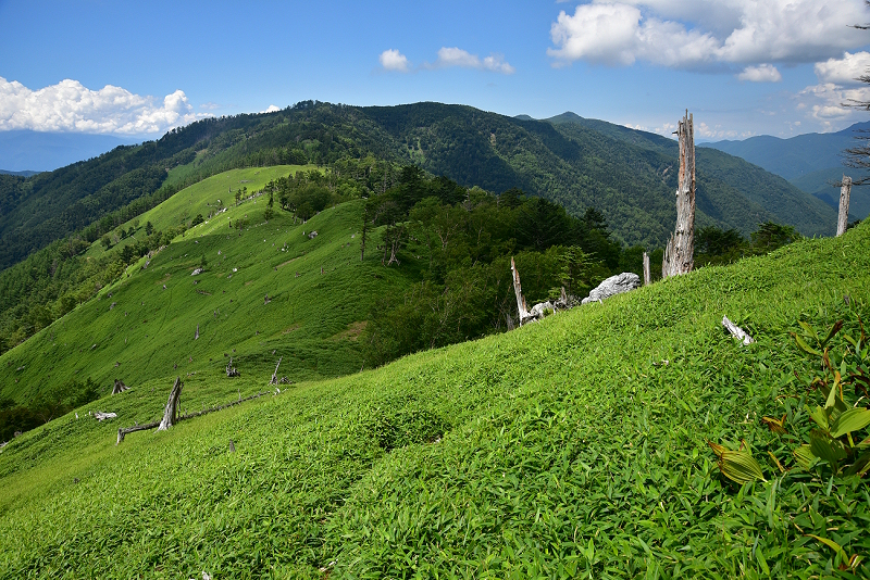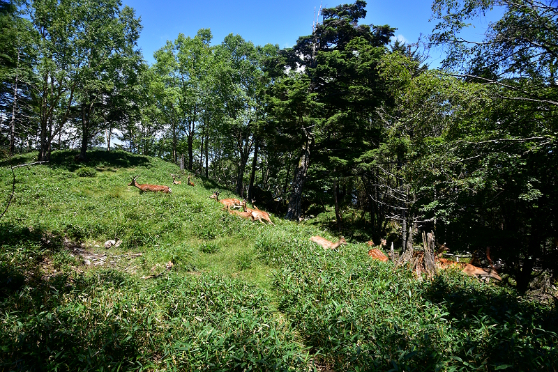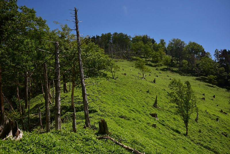 先週に引き続き同じ場所から出発。今日の目的は、先週立ち寄らなかった入山へ足を伸ばす。笹の稜線は、見晴らしが良くて気持ち良い風が吹き抜けて快適だった。鹿だらけなので至る所に糞が転がっているのが難点だった。 |