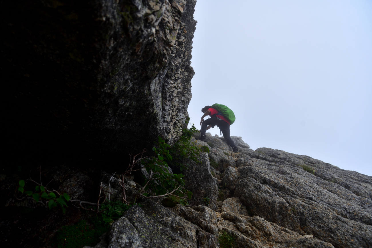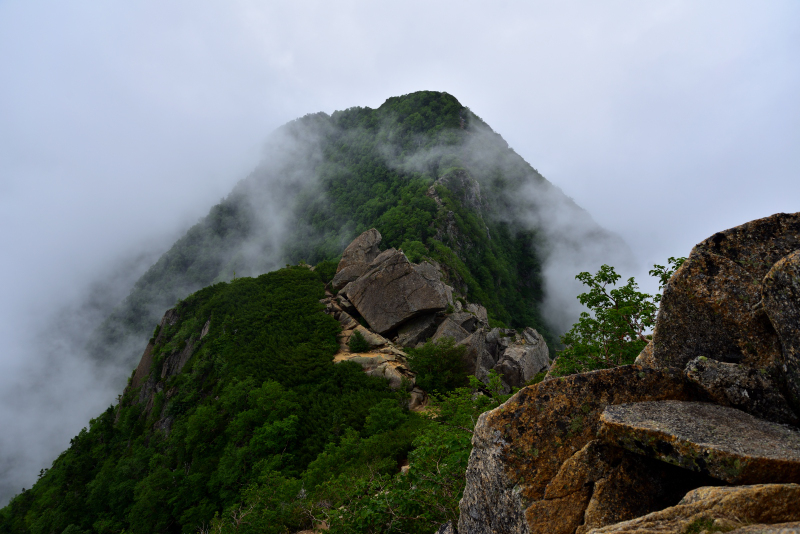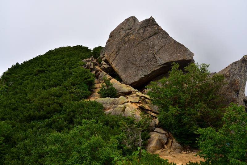 六方岩で雨宿り。しばらくするとガスも取れて雨も上がりました。