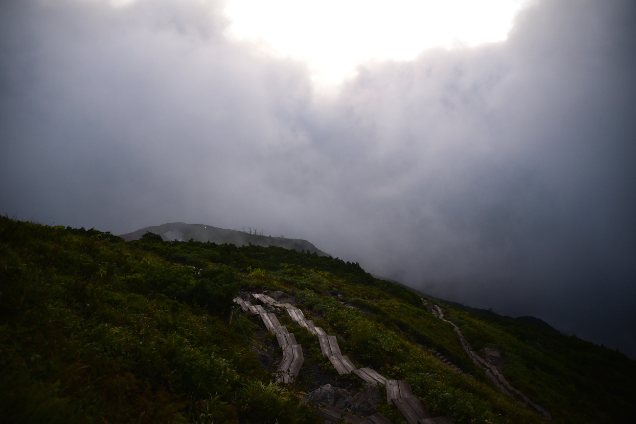 まだ暗いうちから登り始まました。夜が明けてくると雲の中を歩いていた事に気付き、今後の天気が気になります。
