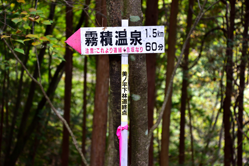 熊野神社(9:00) ~ 子持山(9:41) ~ 林道終点(11:25) ~ 霧積温泉(12:18-12:49) ~ 林道終点(13:58) ~ 熊野神社(15:19)
