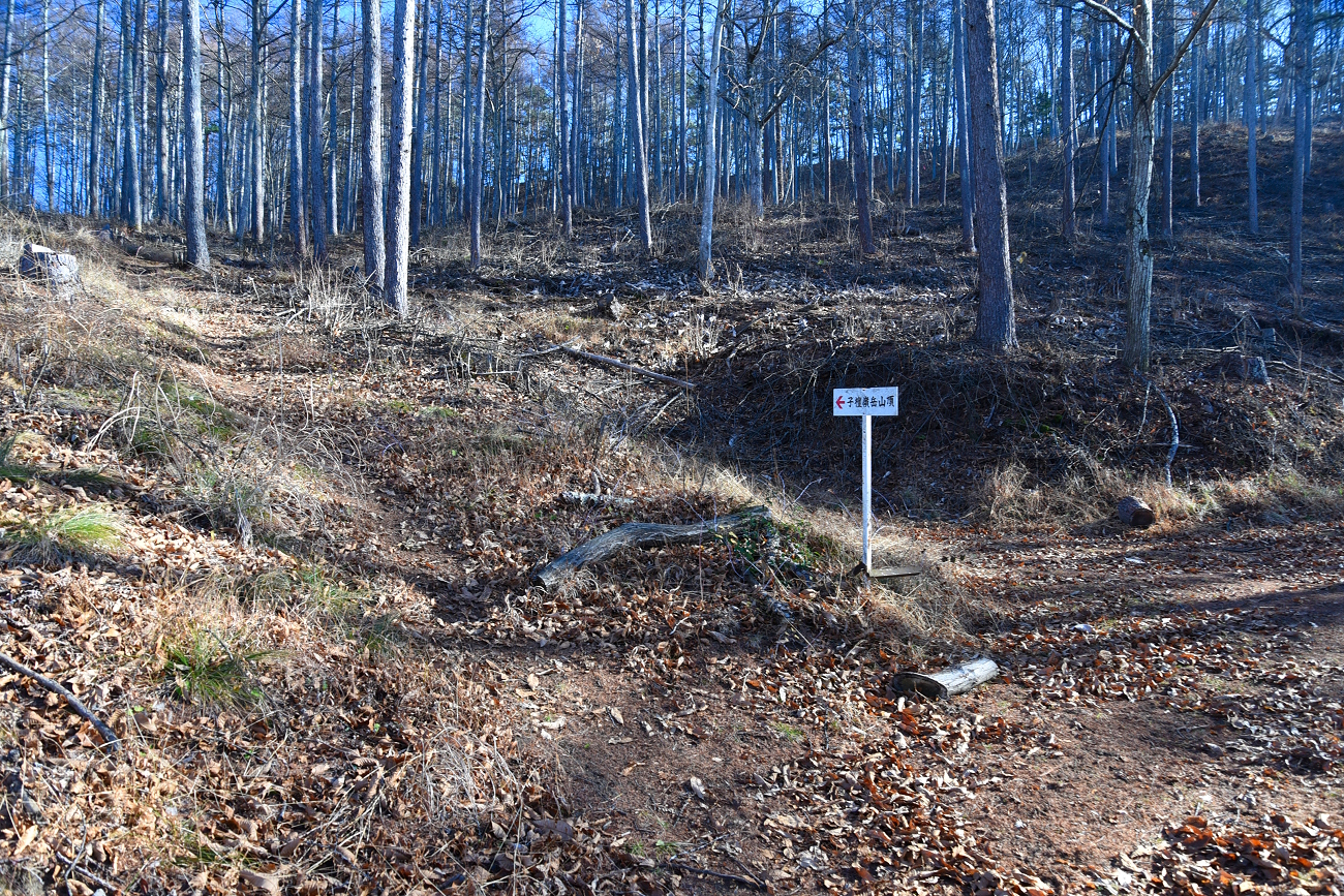 林道の終点付近に登山道の標識がありました。この先は、尾根に出るまで不明瞭な道が続きます。