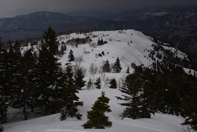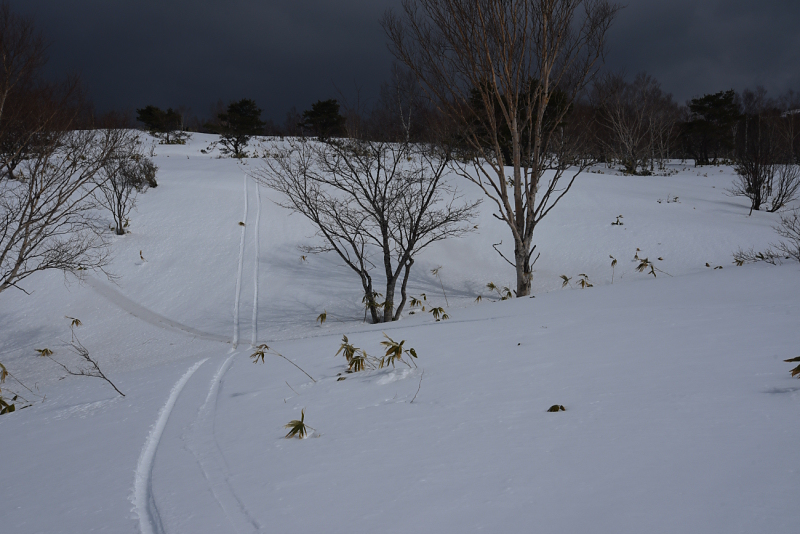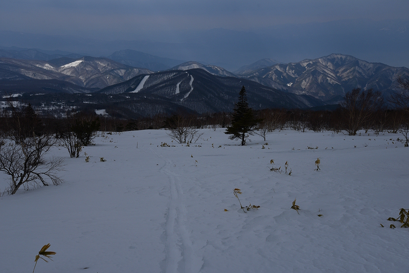 今回は小根子岳から北肩方面に滑り、探索しながら峰の原に戻るコースを選択したが、標高を落とし過ぎた為トラバースする時間が長くなってしまった。 |