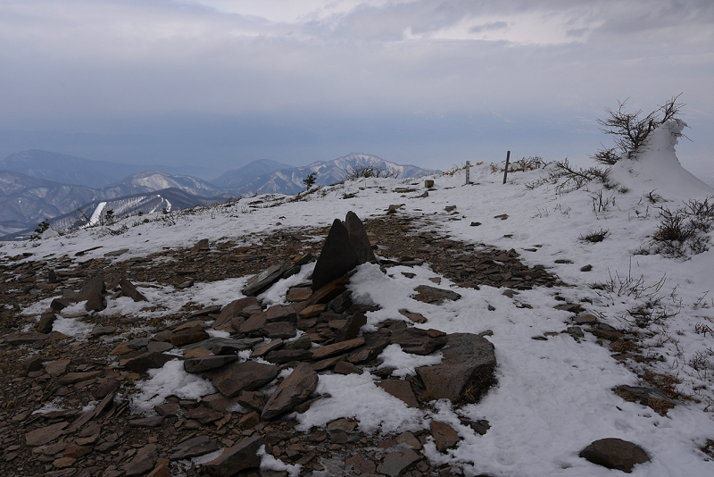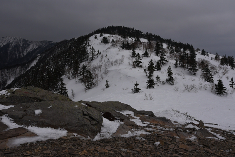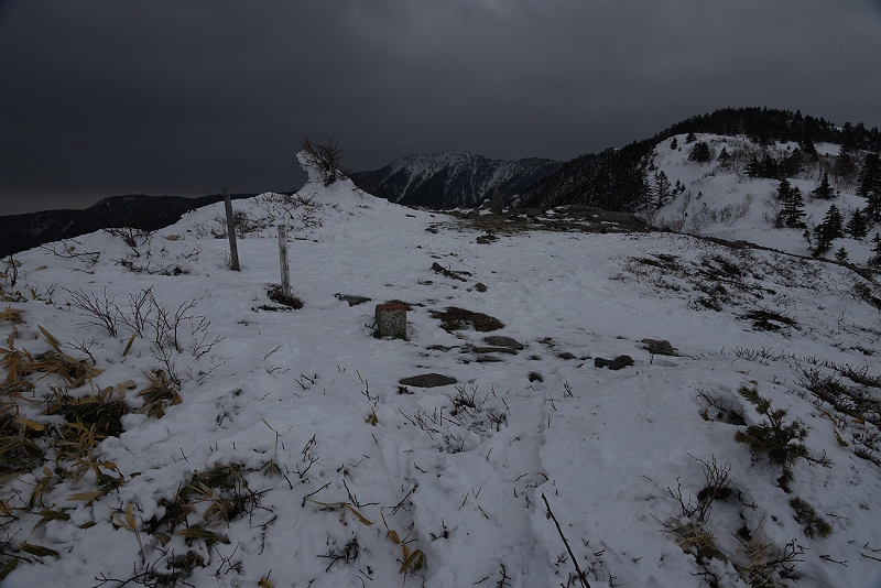 空が真っ黒になってきました。雨が降る前に小根子岳の山頂に到着。