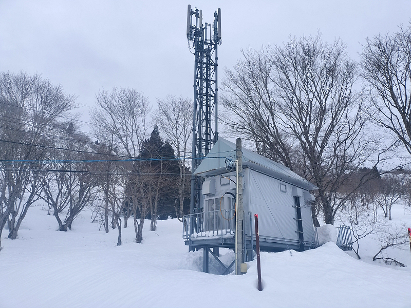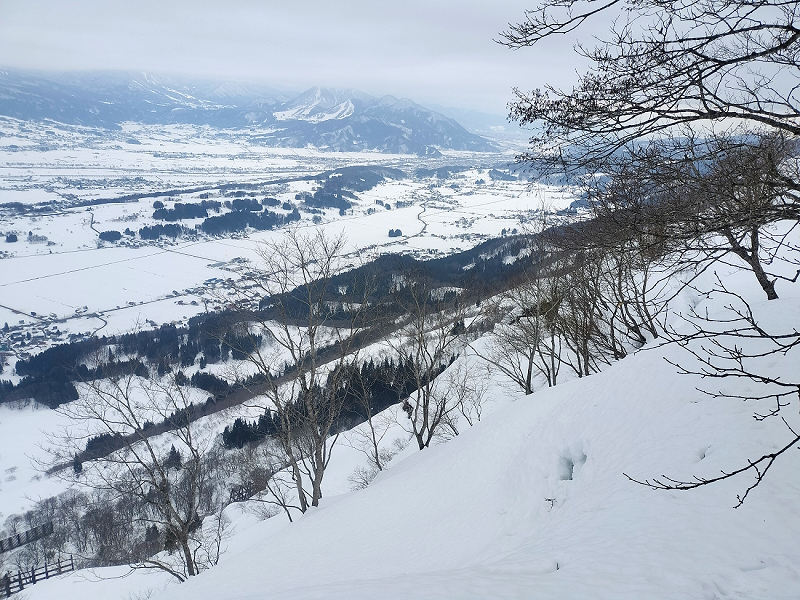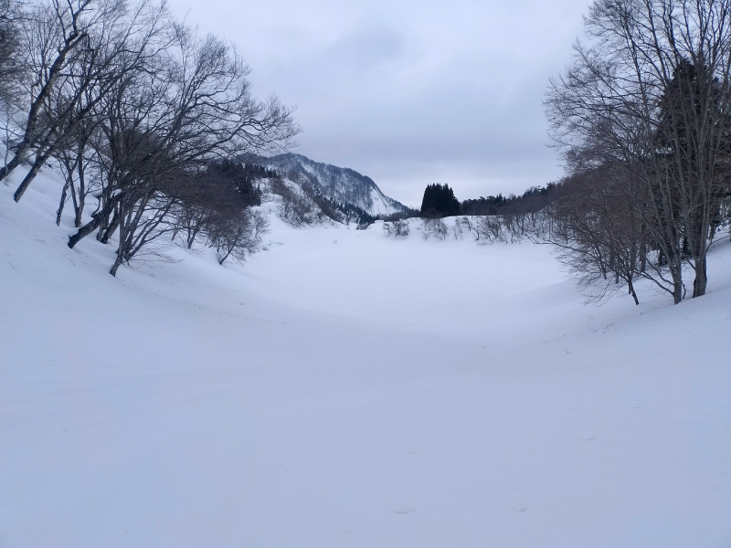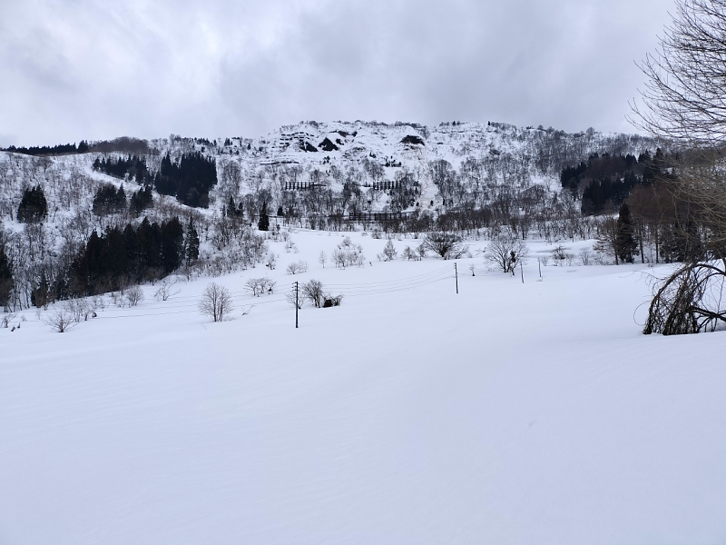 スキー場後跡。正面の壁には雪崩の跡が確認出来る。