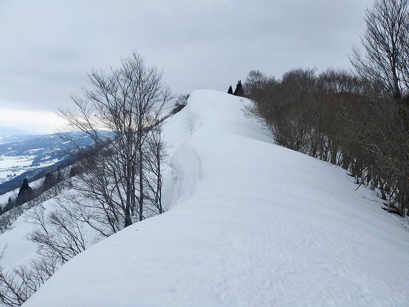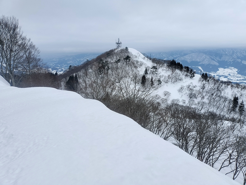 峠の手前で雪庇を越えて稜線へ。鷹落山もたっぷり雪がある。