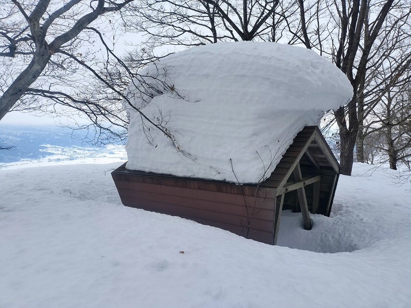ここに車を停めて出発。階段を作らないと雪壁を登れない。