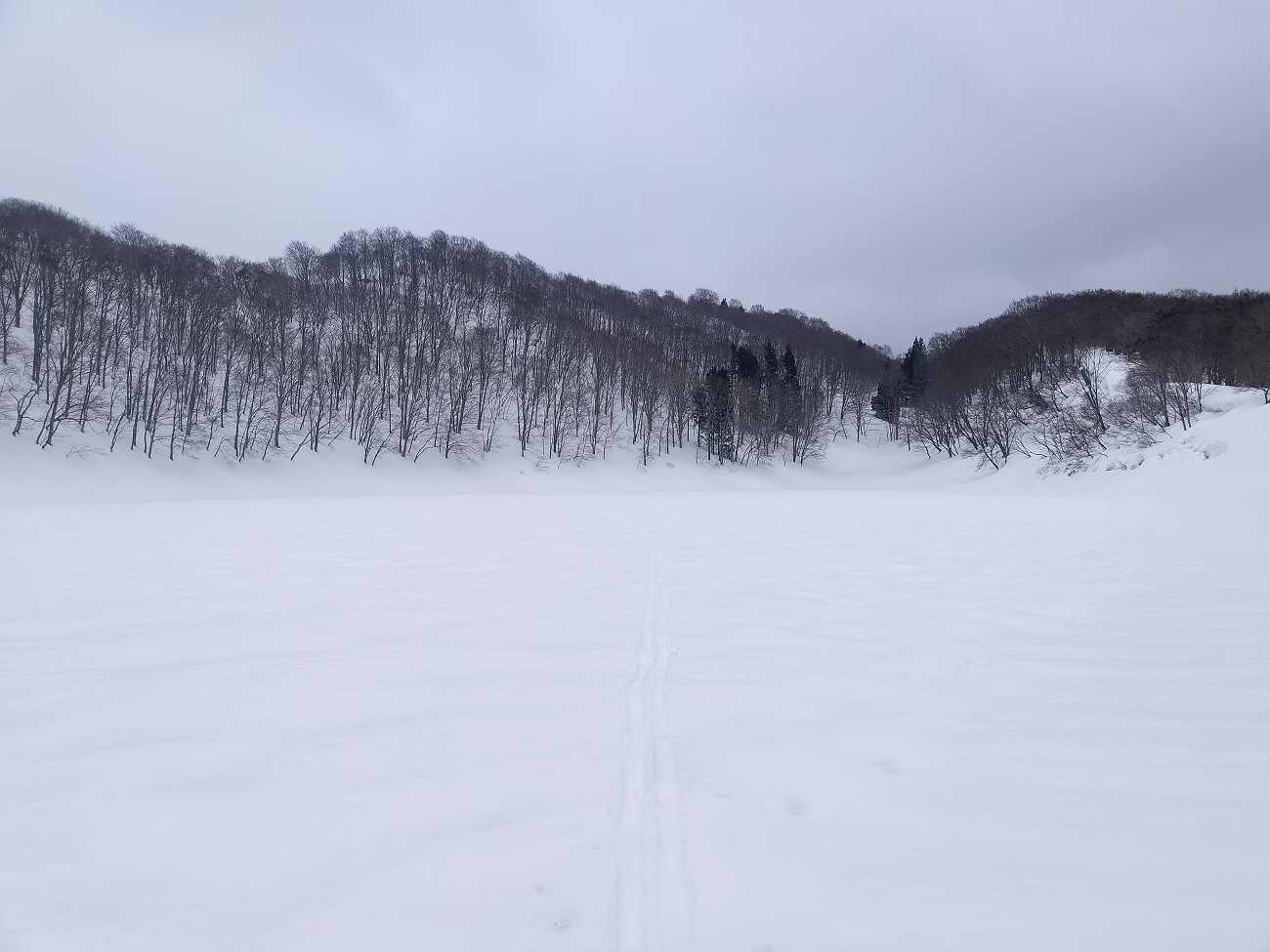 帰りは桂池を横断して下山。雪は少し重かったけど快適に滑れた。 |