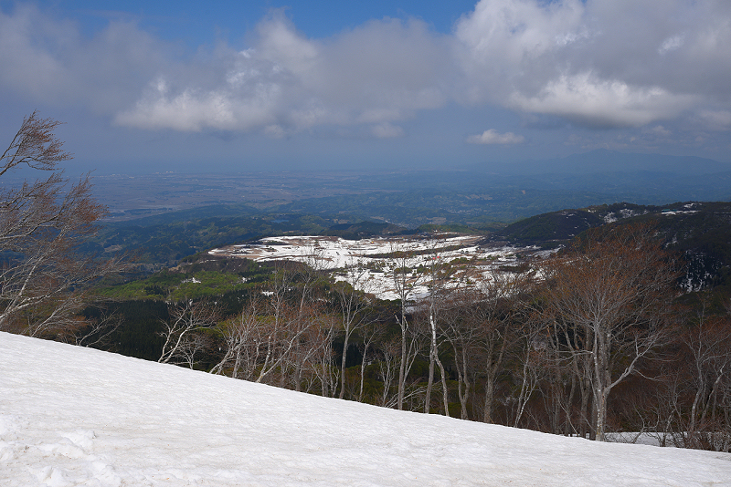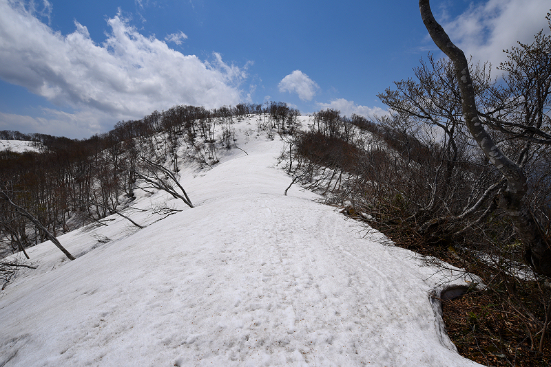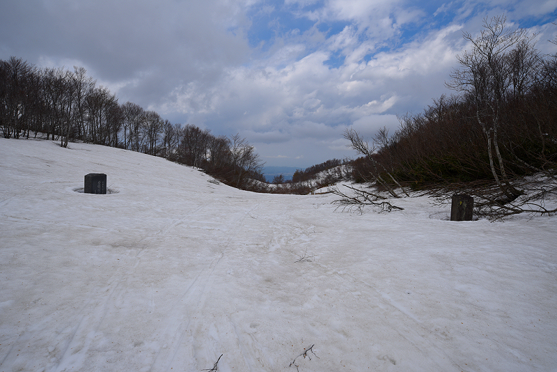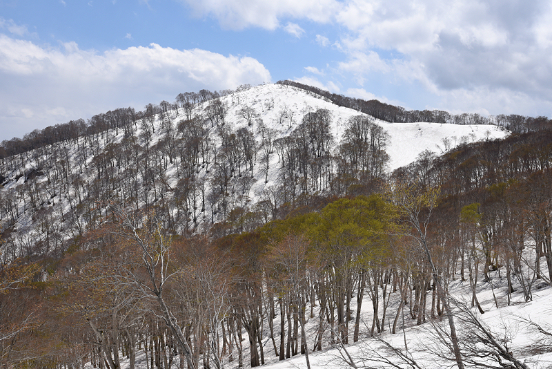 残雪が多かったので、いつもとは違うルートで稜線まで上がり関田峠まで縦走したが、ソールにはブナの皮が張り付いてしまい、まったく滑りはダメだった。 |