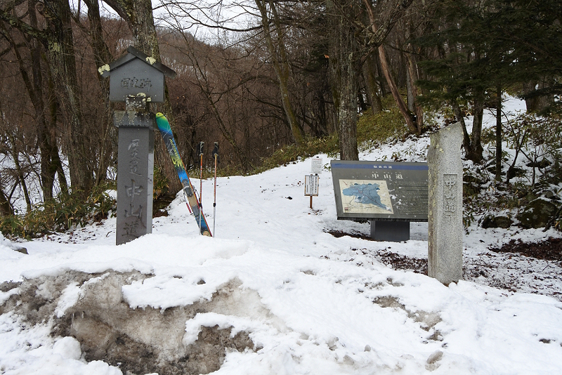 中山道男女倉口からスキーを背負って出発です。