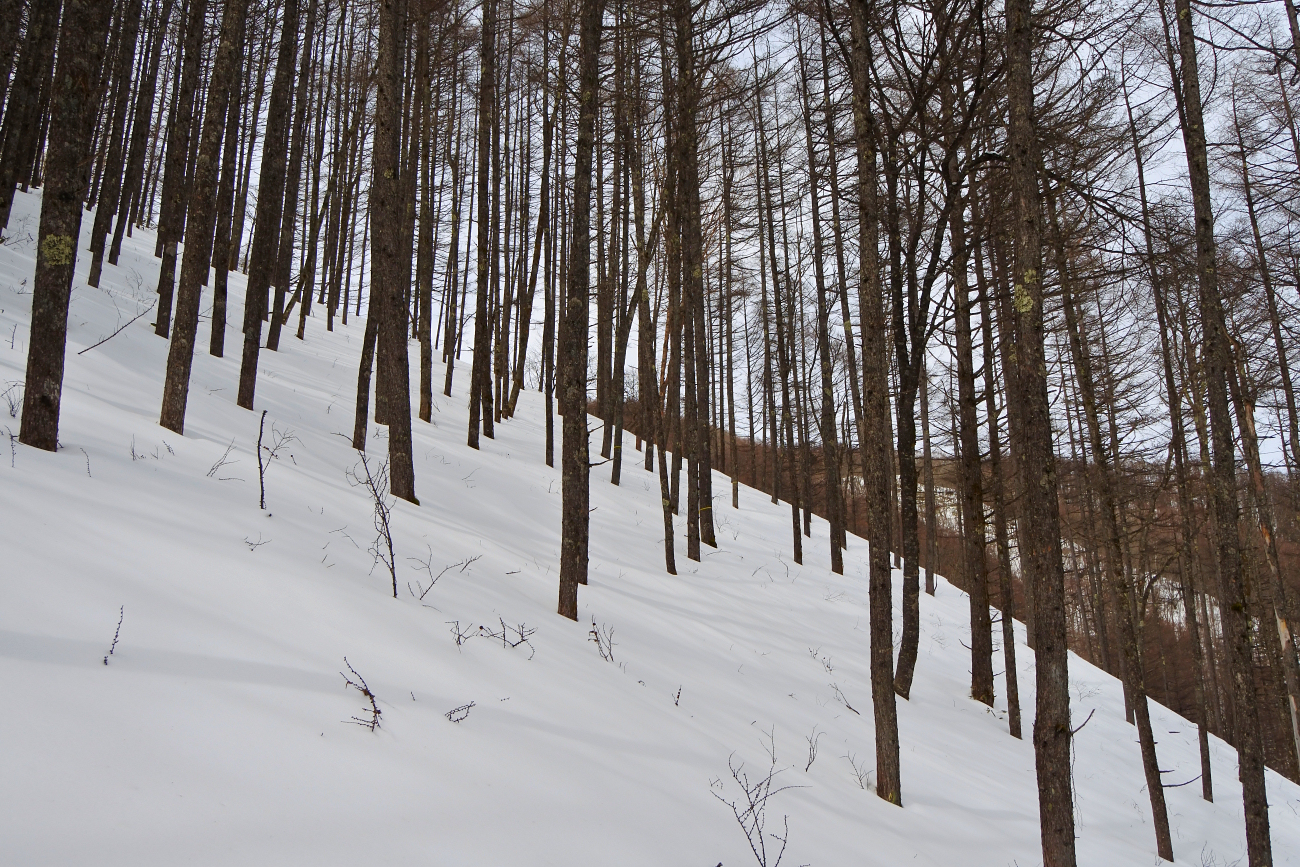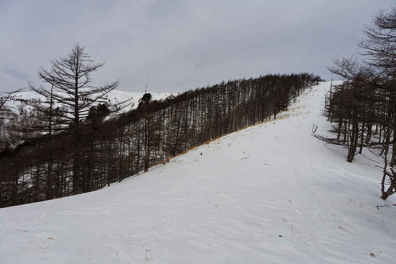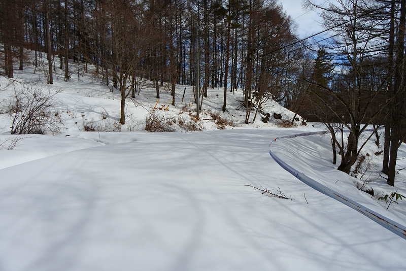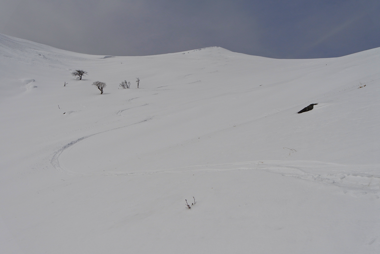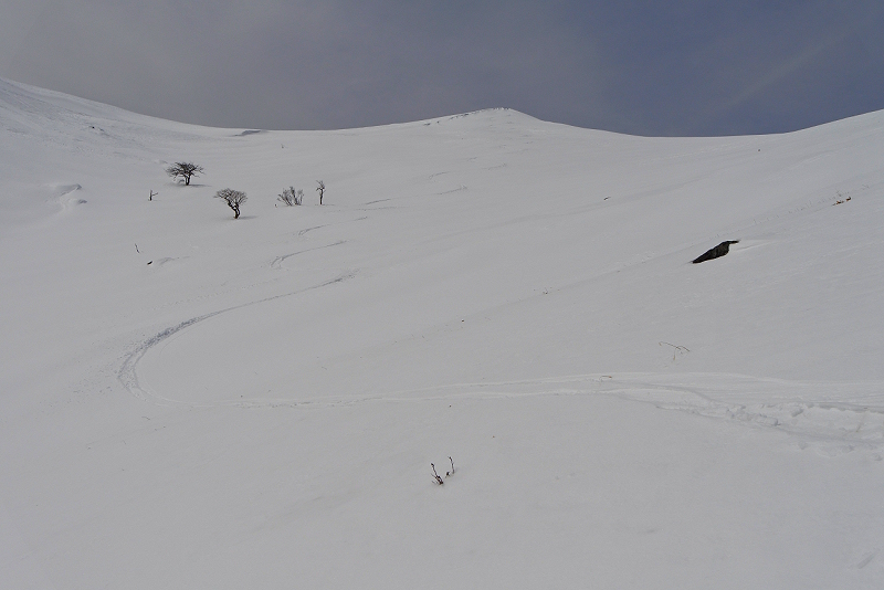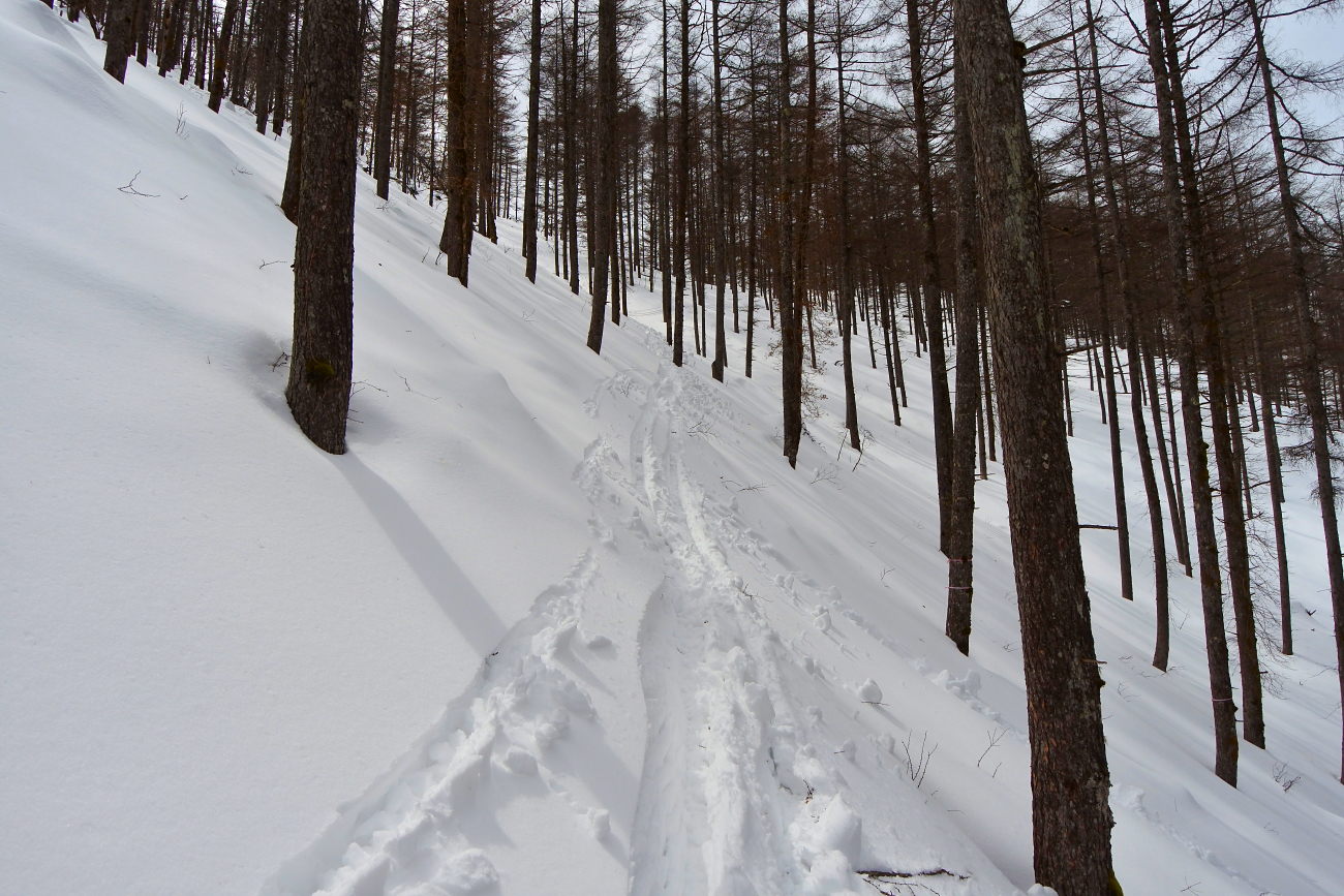 シールに雪が張り付き、ラッセルと合わせて苦痛の登りが続きます。新雪が30cm以上あるので帰りも心配な場所です。